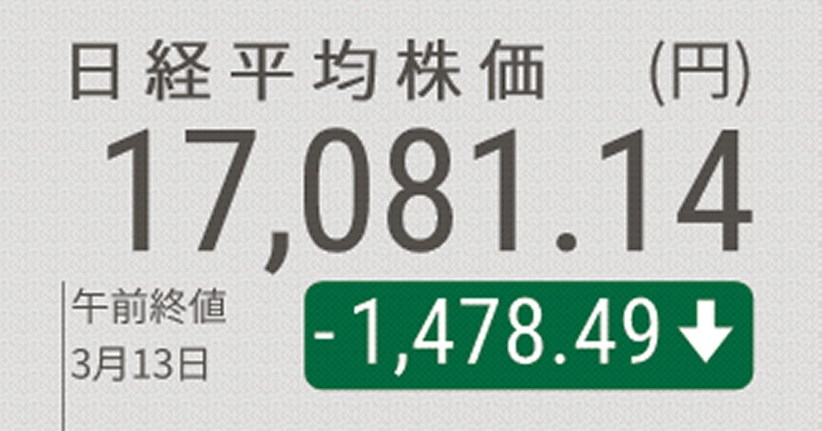 3月12日の東京株式市場で日経平均株価は急落し、前日比856円43銭(4.41%)安の1万8559円63銭で終えた。2017年4月20日以来約2年11カ月ぶりの安値を付けた。下げ幅は今年2番目の大きさ。